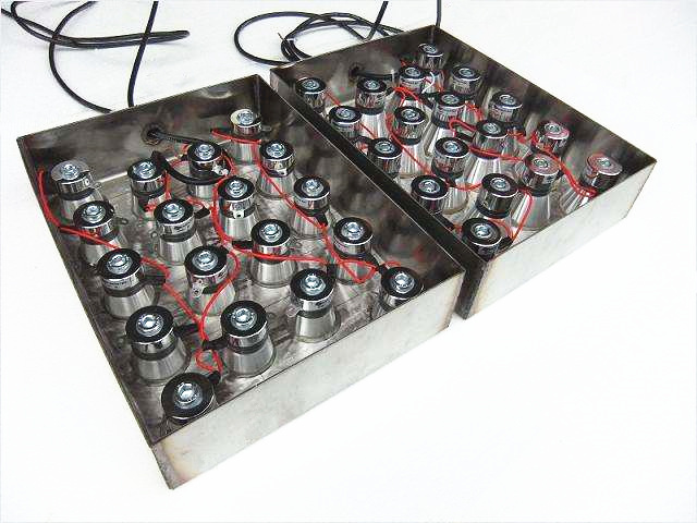 當(dāng)槽式的超聲波清洗設(shè)備不適合特定工作需要時(shí),投入式超聲波振板(震板)除適合自行建造清洗槽或現(xiàn)存清洗槽加裝超聲波清洗功能,也適合現(xiàn)存超聲波清洗設(shè)備的超聲波振板維修替換、適合大型超聲波清洗機(jī)系統(tǒng)內(nèi)配裝超聲波振板、同時(shí)也適合超聲波萃取設(shè)備和超聲波污水處理設(shè)備配裝超聲波。